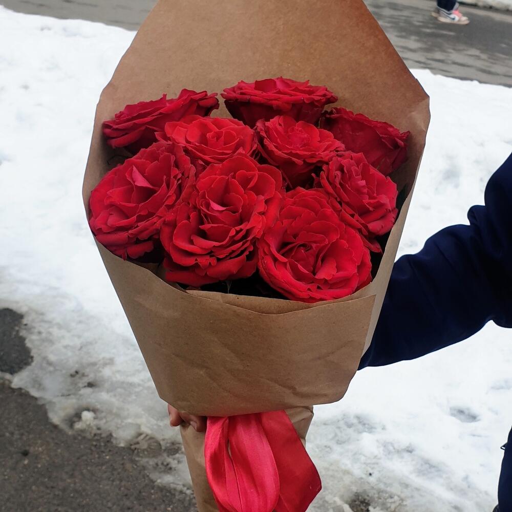 Роза красная – 9 шт.Крафт упаковка – 1 шт.Лента атласная – 1 шт.