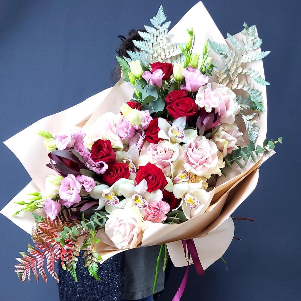 левкадендрон – 3 шт.Лизиантус – 5 шт.Орхидея Цимбидиум – 6 шт.Папоротник – 3 шт.Эвкалипт – 5 шт.Роза – 9 шт.Роза Эквадор – 6 шт.Гвоздика – 5 шт.Фисташка – 7 шт.Упаковка дизайнерская – 1 шт.