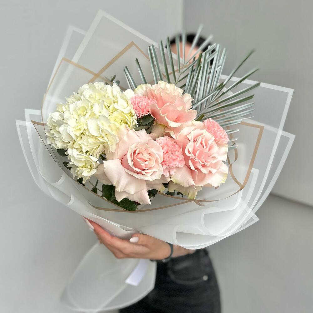 Гортензия – 1 шт.Роза Эквадор – 3 шт.Лента атласная – 2 шт.Диантус – 4 шт.Пальма – 2 шт.Упаковка дизайнерская – 5 шт.