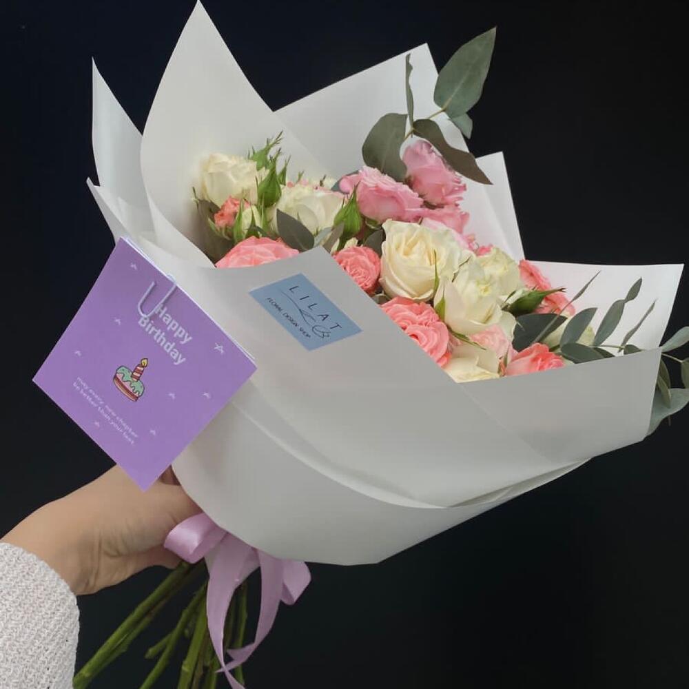 кустовые пионовидные розы – 11 шт. Упаковка дизайнерская – 1 шт. Открыточка с вашими пожеланиями – 1 шт. инструкция по уходу за цветами – 1 шт.