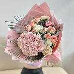 Гортензия – 1 шт.Роза кустовая – 2 шт.Лента атласная – 2 шт.Диантус – 5 шт.Пальма – 1 шт.Упаковка дизайнерская – 5 шт.