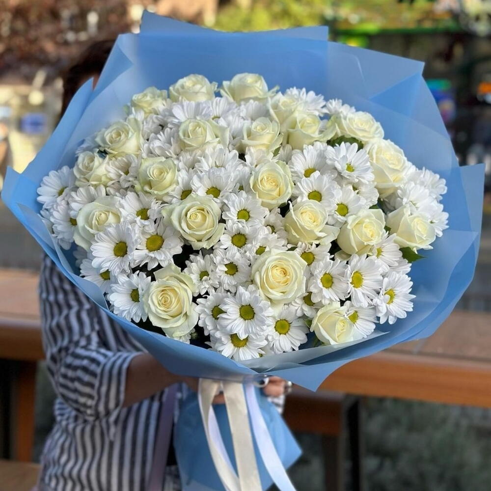 Роза белая – 21 шт. Хризантема кустовая – 18 шт. Современная упаковка – 1 шт.