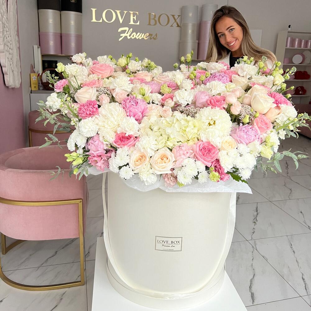 Гортензия – 3 шт.Роза пионовидная – 35 шт.Пион – 7 шт.Эустома – 21 шт.Хризантема кустовая – 14 шт.Диантус – 19 шт.Роза Эквадор – 21 шт.Эвкалипт – 14 шт.Шляпная коробка – 1 шт.