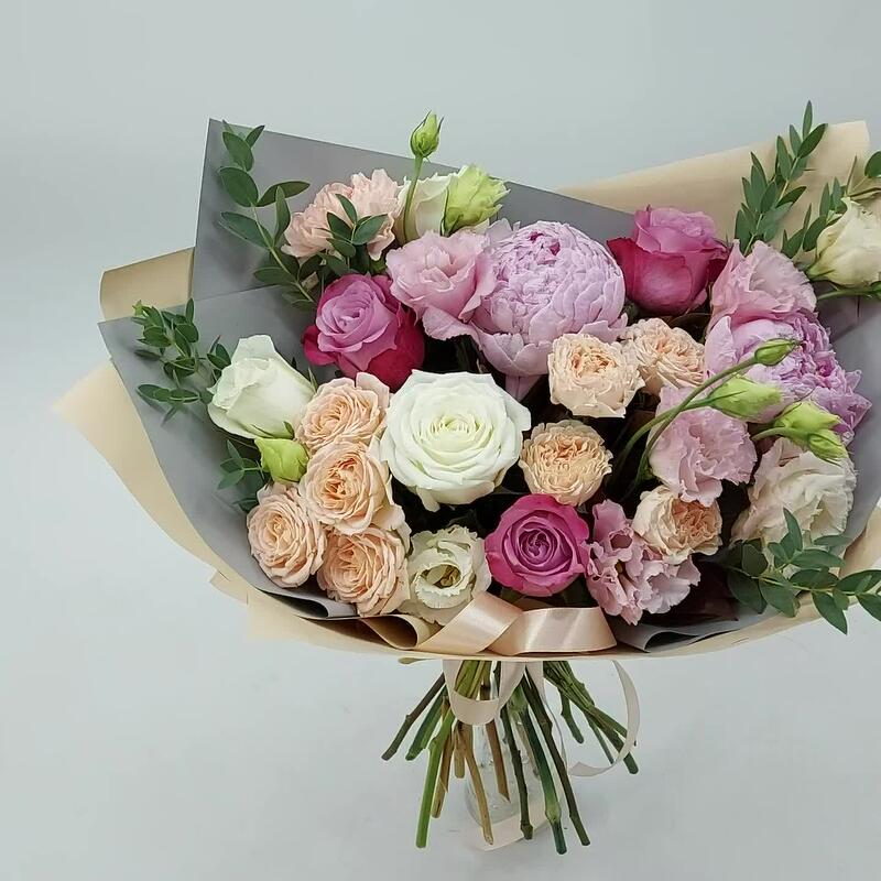 Выразительный, ароматный букет из пионов, роз и эустомы в стильном оформлении. Такой букет всегда уместен и подойдёт для любого повода: День Рождения, именины, годовщина свадьбы, рождение ребенка, 8 марта, День Святого Валентина, выпускной и т.д. Можно вручить маме, сестре, … Показать ещёподруге, коллеге, учителю, любимой.