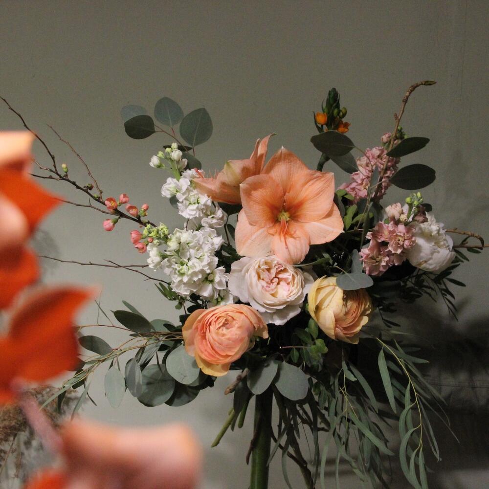 Пионовидные розы, цветущая айва, амариллис, орнитогалум, эвкалипт и маттиола.Стильное цветочное решение для любого случая.