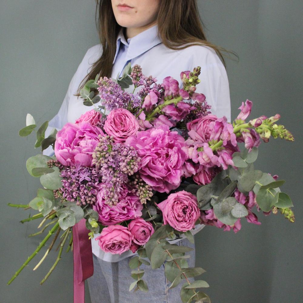 Букет с сиренью, пионами, львиным зевом, пионовидными розами и эвкалиптом.Отличный выбор для подарка на день всех влюблённых, 14 февраля.