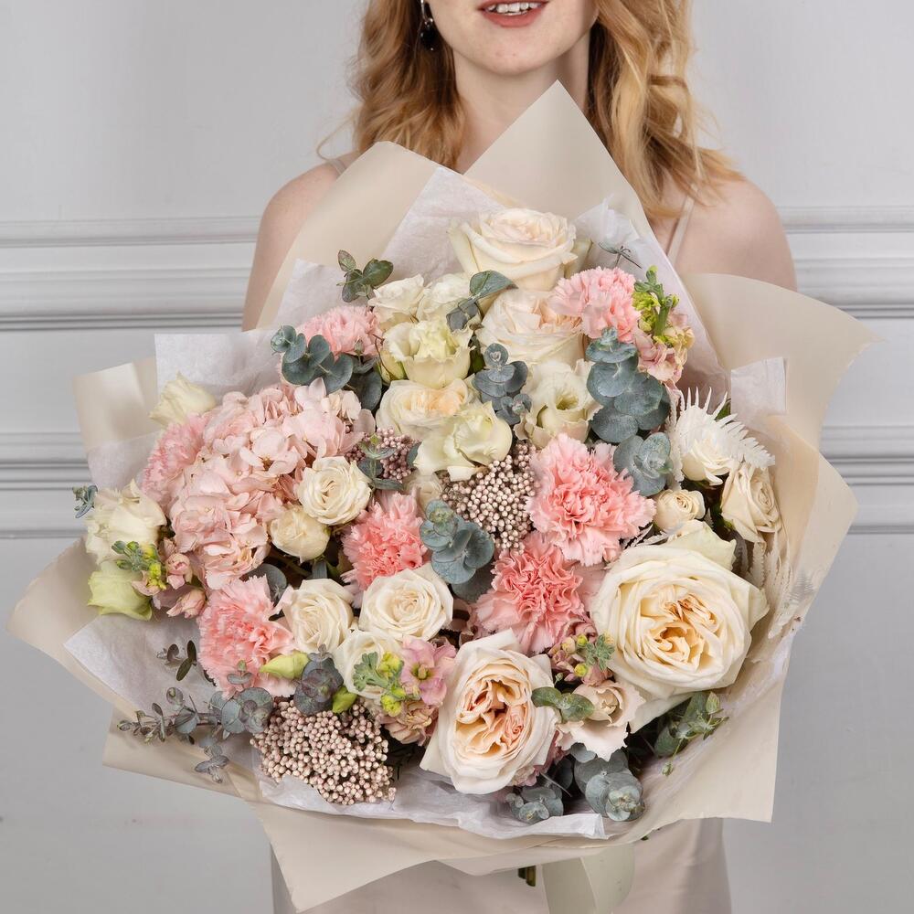 Гортензия – 1 шт.Эвкалипт – 5 шт.Маттиола – 7 шт.Эустома – 4 шт.Озотамнус – 3 шт.Диантус – 7 шт.Кустовая пионовидная роза – 5 шт.white o’hara – 5 шт.Упаковка дизайнерская – 2 шт.Писташ – 1 шт.Папоротник – 3 шт.