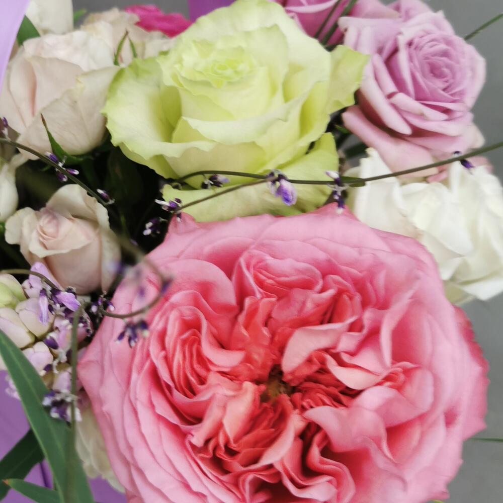 Пионовидная роза – 2 шт. Кустовая роза – 5 шт. Тюльпан – 2 шт. Гениста – 2 шт. Роза одноголовая – 2 шт. Эвкалипт – 1 шт. Гиацинт – 1 шт. Оазис – 1 шт. Сумочка – 1 шт. Открыточка с вашими пожеланиями – 1 шт.