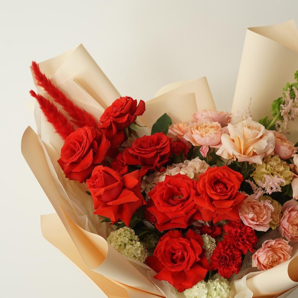 Роза французская – 10 шт.Роза кустовая джульетта – 2 шт.Астильба – 3 шт.Молюцелла – 2 шт.Гортензия – 1 шт.Диантус – 8 шт.Вибурнум – 2 шт.пампасная трава – 2 шт.Упаковка – 1 шт.