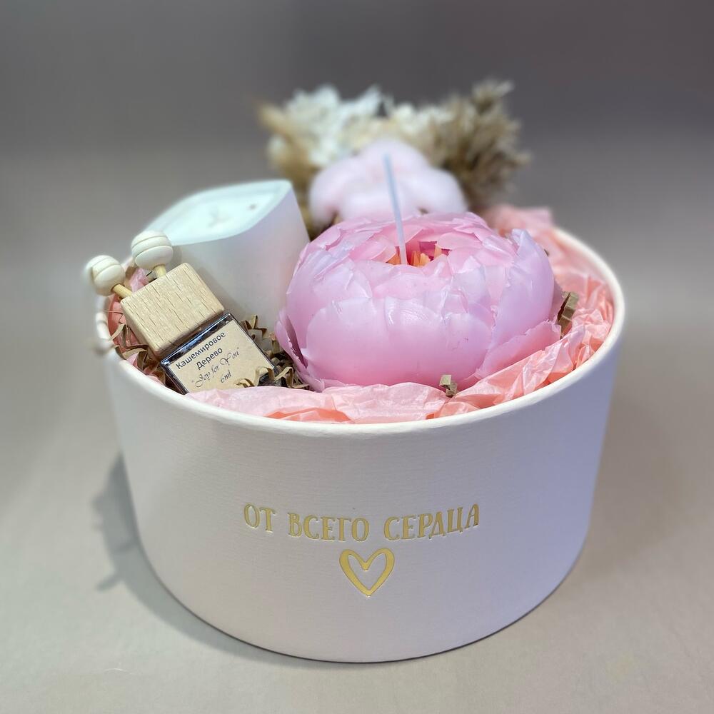 Хлопок – 1 шт.Тишью – 1 шт.Коробка – 1 шт.диффузор – 1 шт.гортензия стабилизированная – 1 шт.свеча в гипсовом стаканчике – 1 шт.свеча-пион – 1 шт.Лагурус – 3 шт.