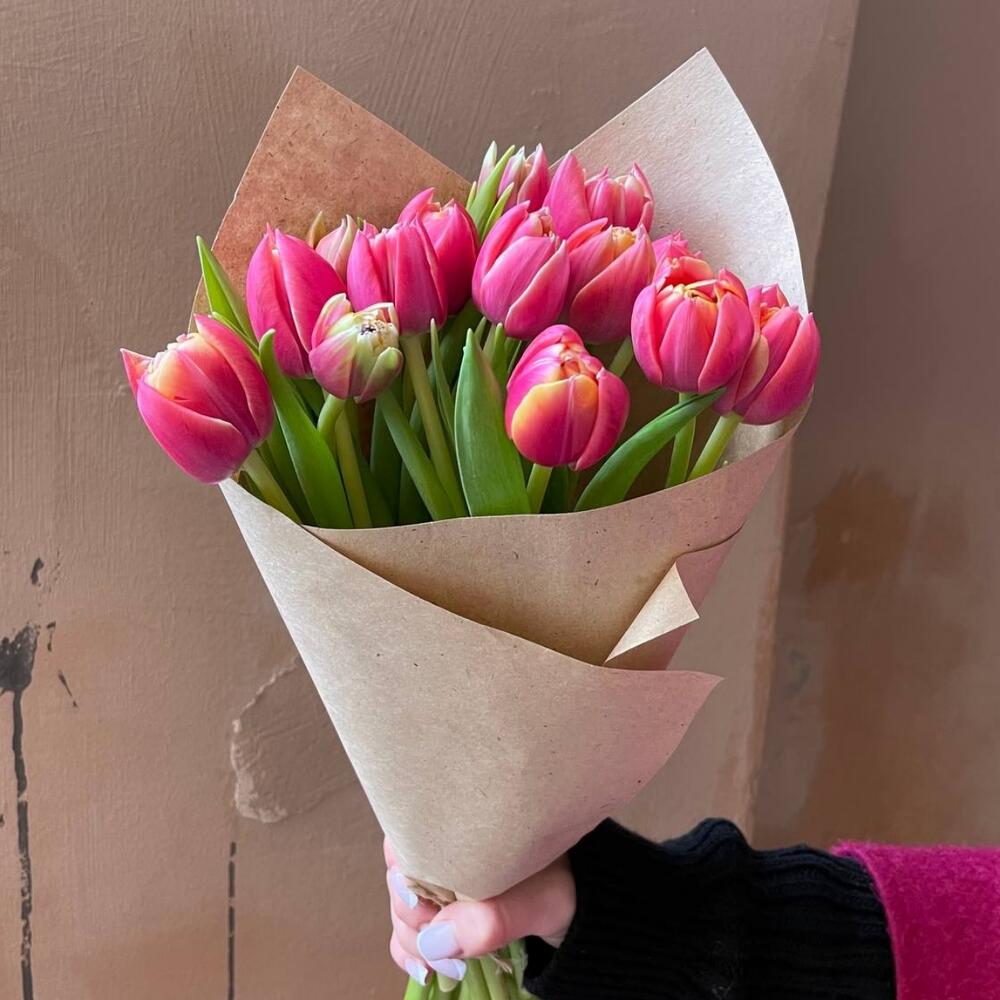 Крафтовая упаковка – 1 шт.Розовый пионовидный тюльпан – 15 шт.