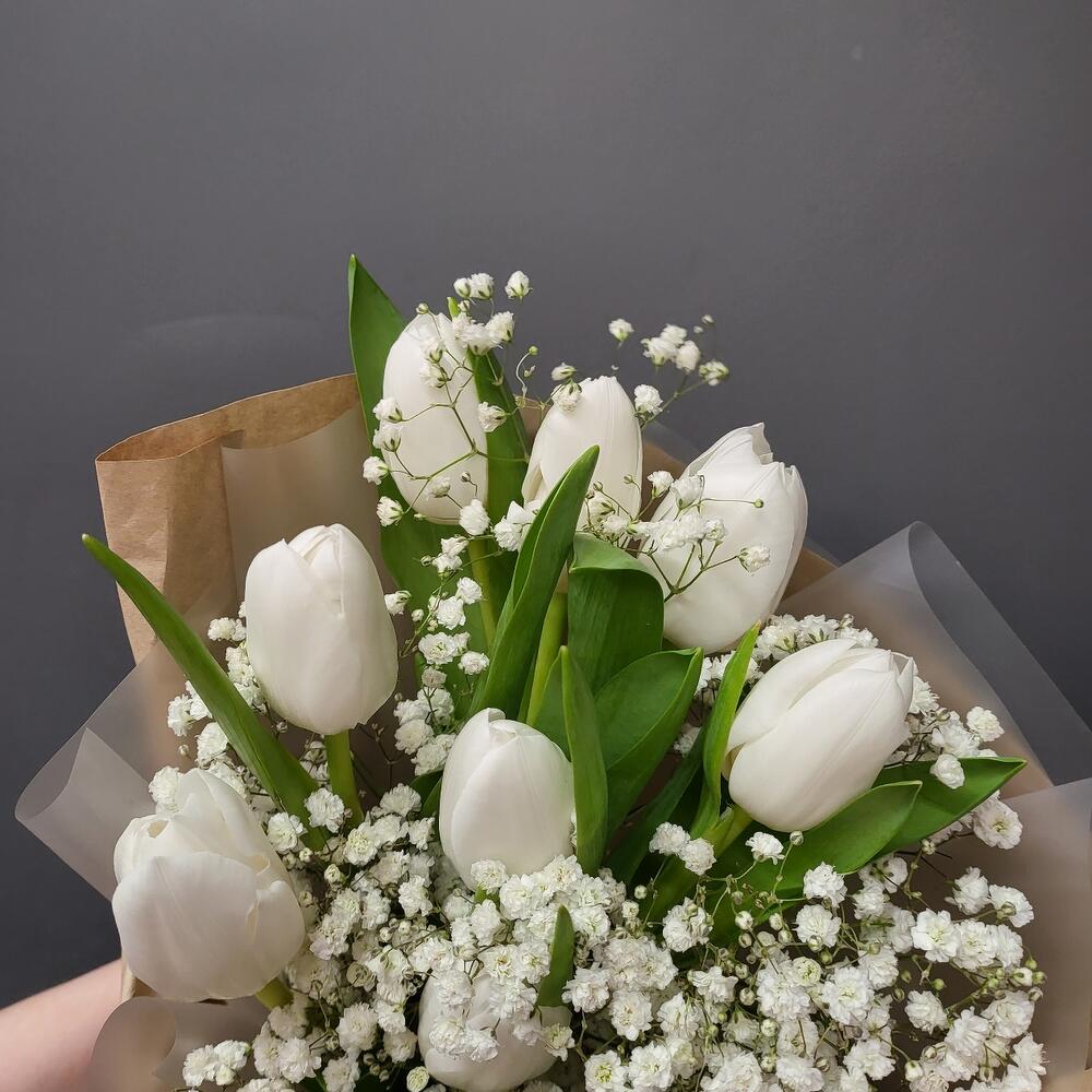 Тюльпан белый – 9 шт.Гипсофила – 2 шт.Упаковка дизайнерская – 1 шт.
