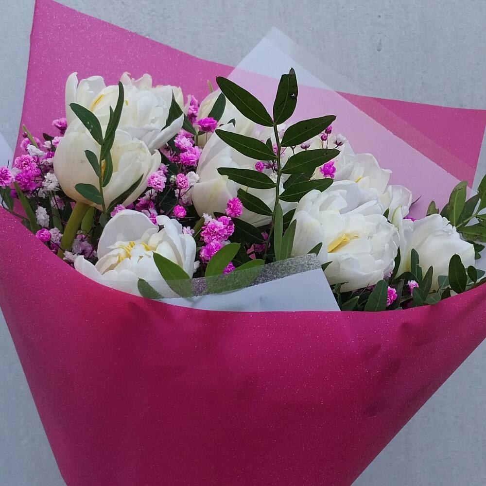 Лента атласная – 1 шт.Упаковка дизайнерская – 2 шт.Гипсофила розовая – 1 шт.тюльпан пионовидный белый – 11 шт.фисташка зелень – 5 шт.